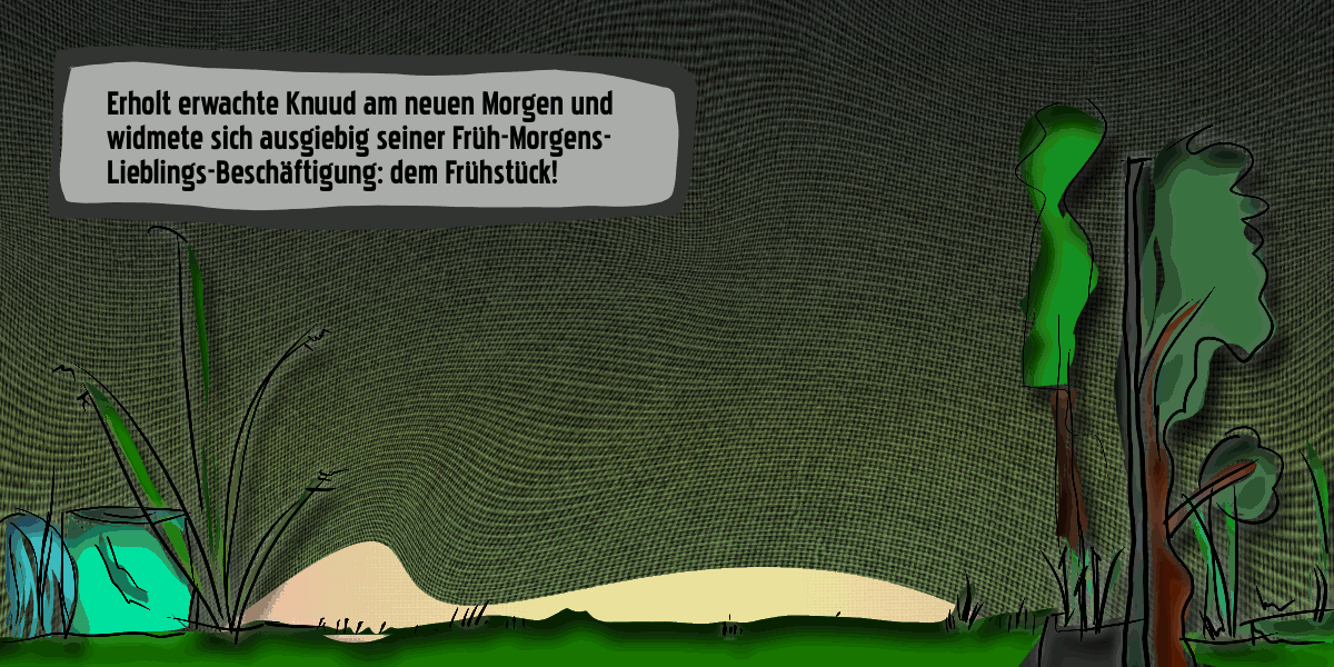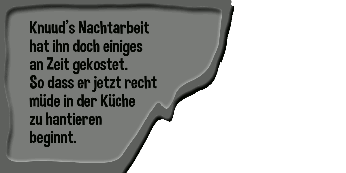 Knuud wacht in 000-014 ➚ parallel auf und richtet sich für den Werktag in 000-015 ➚ und macht Vesper am Werktag für Kaatja und die Kids in 000-016 ➚ – aber es müsste ja Mittwoch der Feiertag sein nach der Vorgeschichte mit Kattlens und Luzzies Vereisen am Dienstag. In 000-017 ➚ lässt Knuud die Nachtarbeit zuvor Revue passieren und in 000-018 ➚ sorgt er sich um die Jumbogräser und bekommt eine geniale Idee. 000-019 ➚ zeugt dann eindeutig davon, dass Ksavver auch am Feiertag richtig arbeiten muss und auch etliches an Terminen abzuwickeln hat und nach dem wichtigsten ist er in 000-020 ➚ dann mit dem Schlitten am Pforti vorbei auf dem Heimweg zu Tapcy, während in 000-021 ➚ bei Knuud mit der rückkehrende Familie ein bisher einfacher Heiße Leine Tag noch eine spontane Wende nimmt.