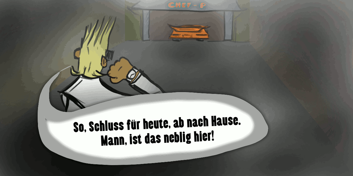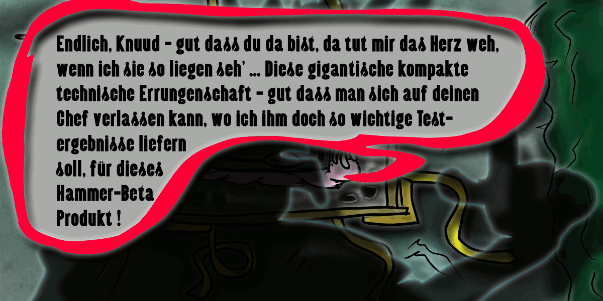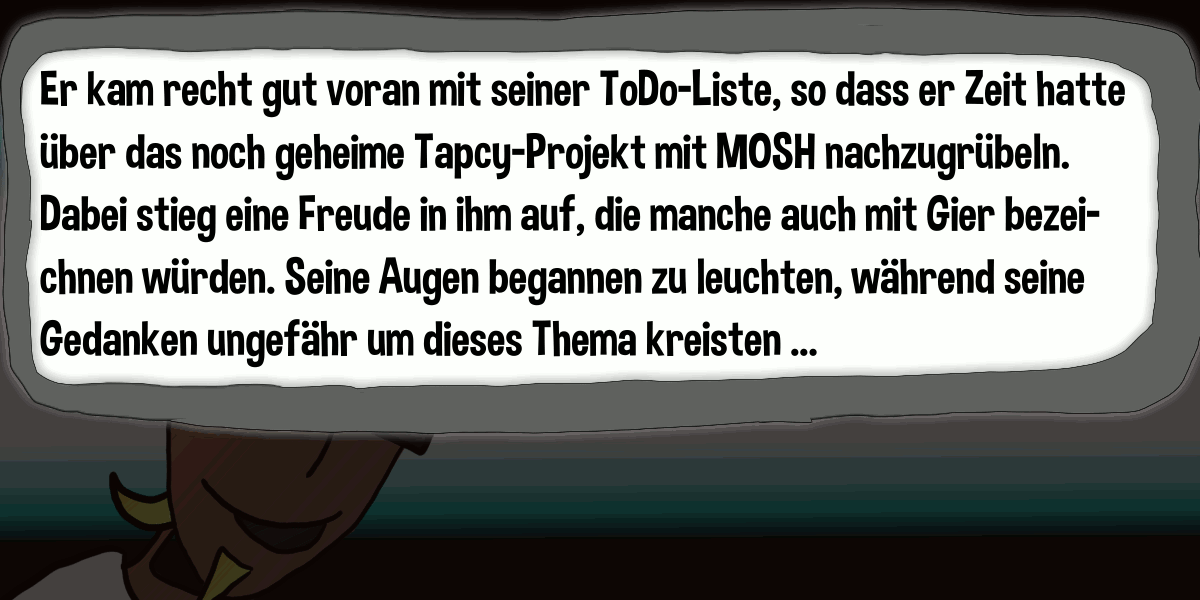 Nach der Vorstellung der BETA-KI “Tapcy” in 000-006 ➚, ist es immer noch Dienstag, als er in 000-007 ➚ von seinem MOSH-Chef per Notfall-Standleitung direkt kontaktet wird und sich dann doch um Ksavvers Problem kümmern muss, was er in 000-008 ➚ am gleichen Tag noch tut.
