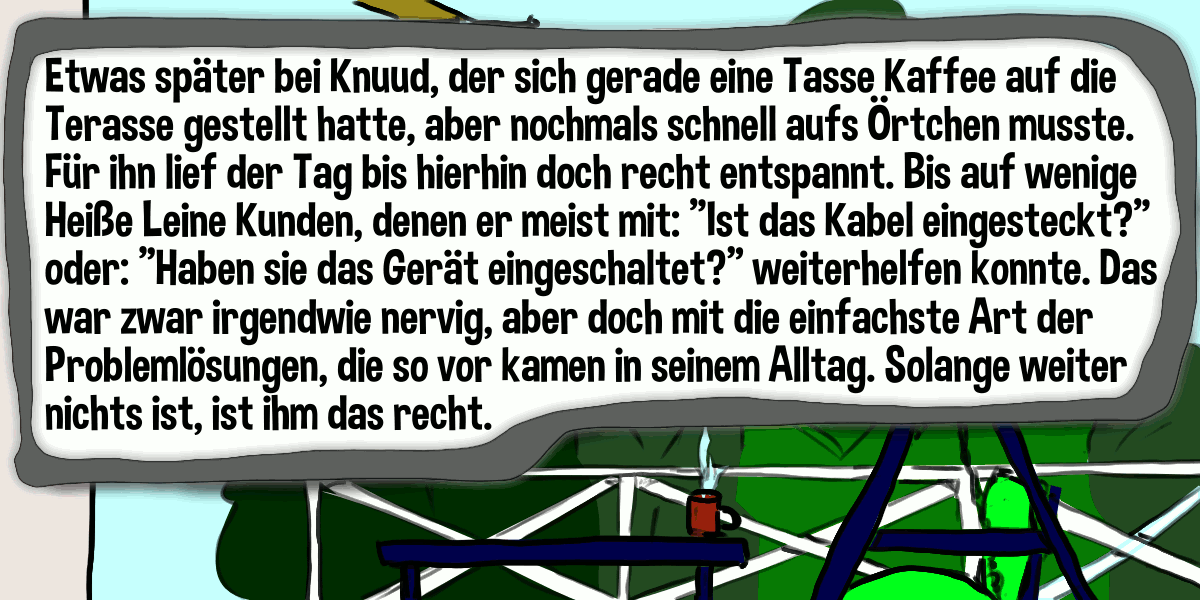 Die Folge 000-004 ➚ beginnt am Dienstag in der früh mit Knuud in seinem Garten, weil die Heiße Leine noch keinen Mucks gemacht hatte, wo er sich Sorgen um seinen grünen Zaun macht und plötzlich dieses bedrohlich schnell näherkommende Geräusch wahrnimmt.